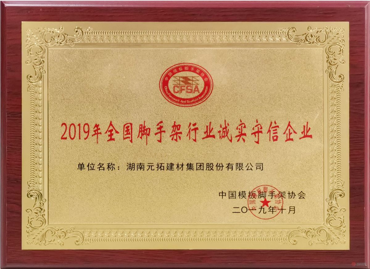 因信行?以诚立丨元拓荣膺“2019年全国脚手架行业诚实守信企业”
